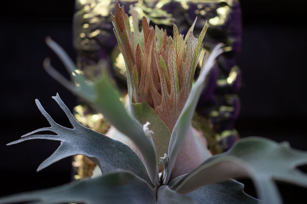 One of the highlights of this hybrid is the textured, silvery fronds that can display strong veining and a powdery coating, giving the plant a luminous quality in bright light. The upright growth habit adds to its architectural presence, making it both a statement piece and a conversation starter among staghorn fern enthusiasts.